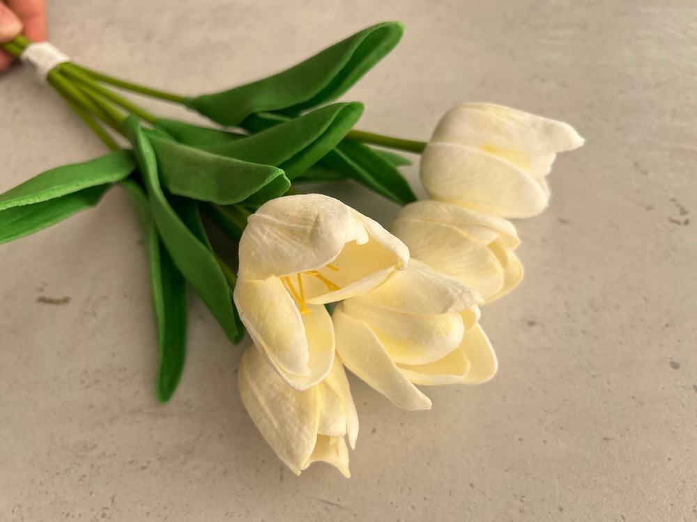 دسته گل لاله نیمه باز سفیدکرمی لمسی ( 5 شاخه) درجه دو