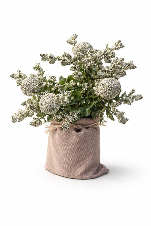 این گلدان تزئینی شامل گیاه مصنوعی برونیا با طراحی خاص و مدرن است که داخل یک گلدان پارچهای حصیری کوچک قرار گرفته. بافت طبیعی برگها و دانههای کرویشکل، در کنار رنگبندی خنثی و واقعی، جلوهای بسیار شبیه به گیاه طبیعی ایجاد کرده است.