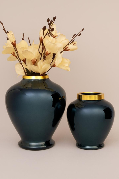 گلدان شیشهای مدل کد 7 با طراحی کلاسیک و بدنه سیقلشده، جلوهای لوکس و مدرن را به فضای شما میبخشد. رنگ سورمهای (آبی رویال) با رینگ طلایی براق، ترکیبی چشمنواز ایجاد کرده که هم برای دکوراسیون مدرن و هم کلاسیک مناسب است. شفافیت و کیفیت بالای شیشه در کنار پرداخت صیقلی، باعث انعکاس زیبای نور و افزایش جذابیت آن میشود.